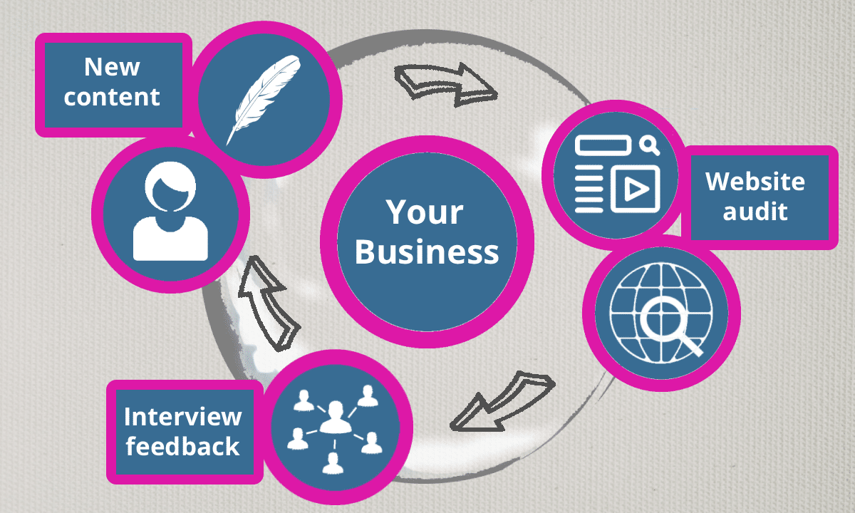 Clarity’s services work together to give you insights about your current web content, combines that with insights from your customers to provide you with authentic marketing content. Each cycle improves how you communicate and stronger engagement with your customers.